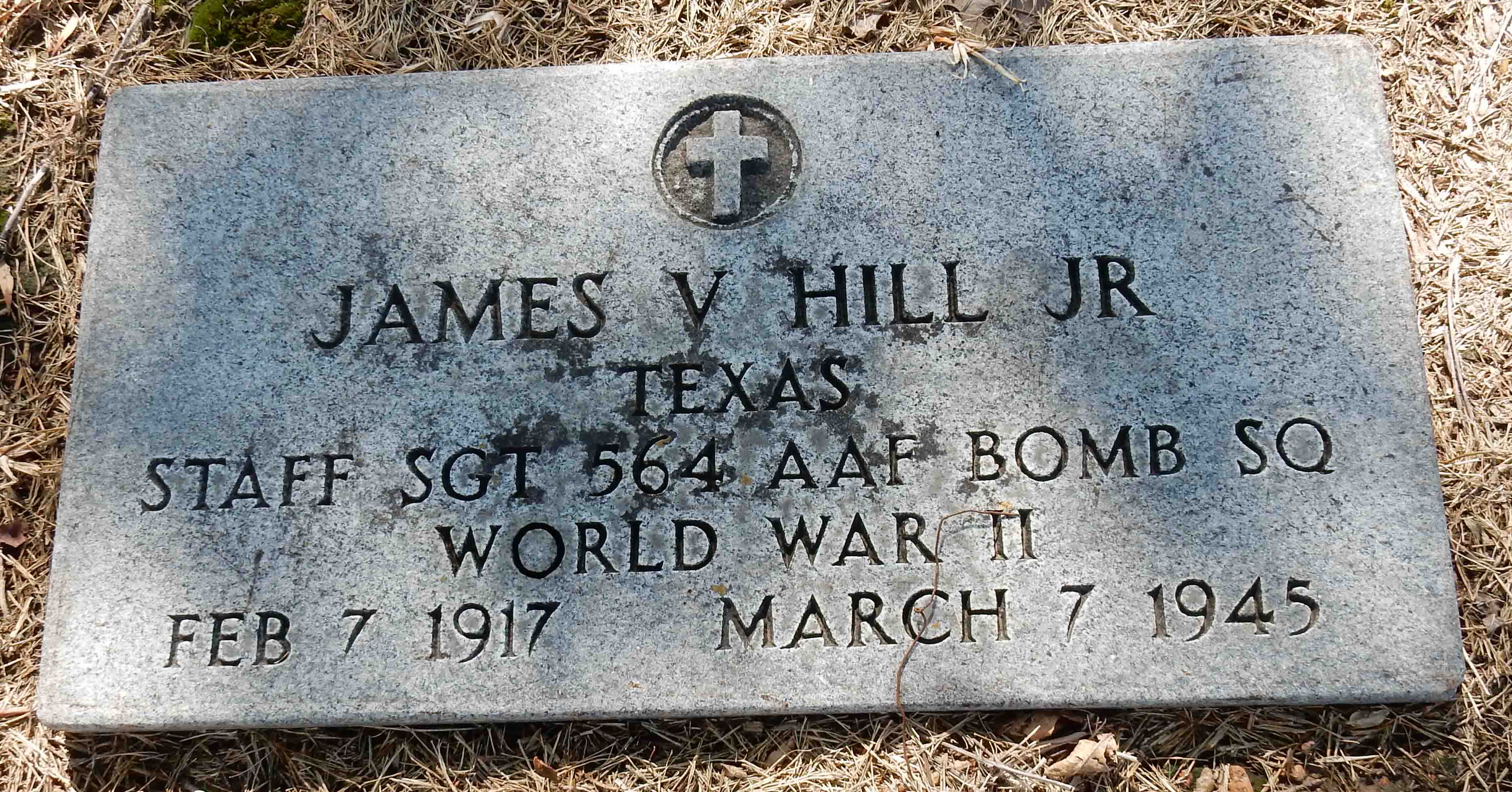 James V. Hill, Jr. was born on February 7, 1917. He served in the 564th Bombardment Squadron, 389th Bombardment Group, as a Staff Sergeant and Gunner on the B-24J 42-51343 'Shazam' in World War II. On March 7, 1945, Shazam's crew was scheduled on a mission to bomb oil and communication facilities as well as railway marshaling yards at Soest, Germany. The weather at take-off was very bad. Clouds and icing conditions prohibited anyone from accurately observing the take-off. However, three witnesses state they saw the aircraft as it descended through the clouds. It appeared to level off, a wing separated from the aircraft, and fire broke out. The fuselage impacted the ground near Old Costessey, England, in Norfolk, and exploded. There were no survivors.