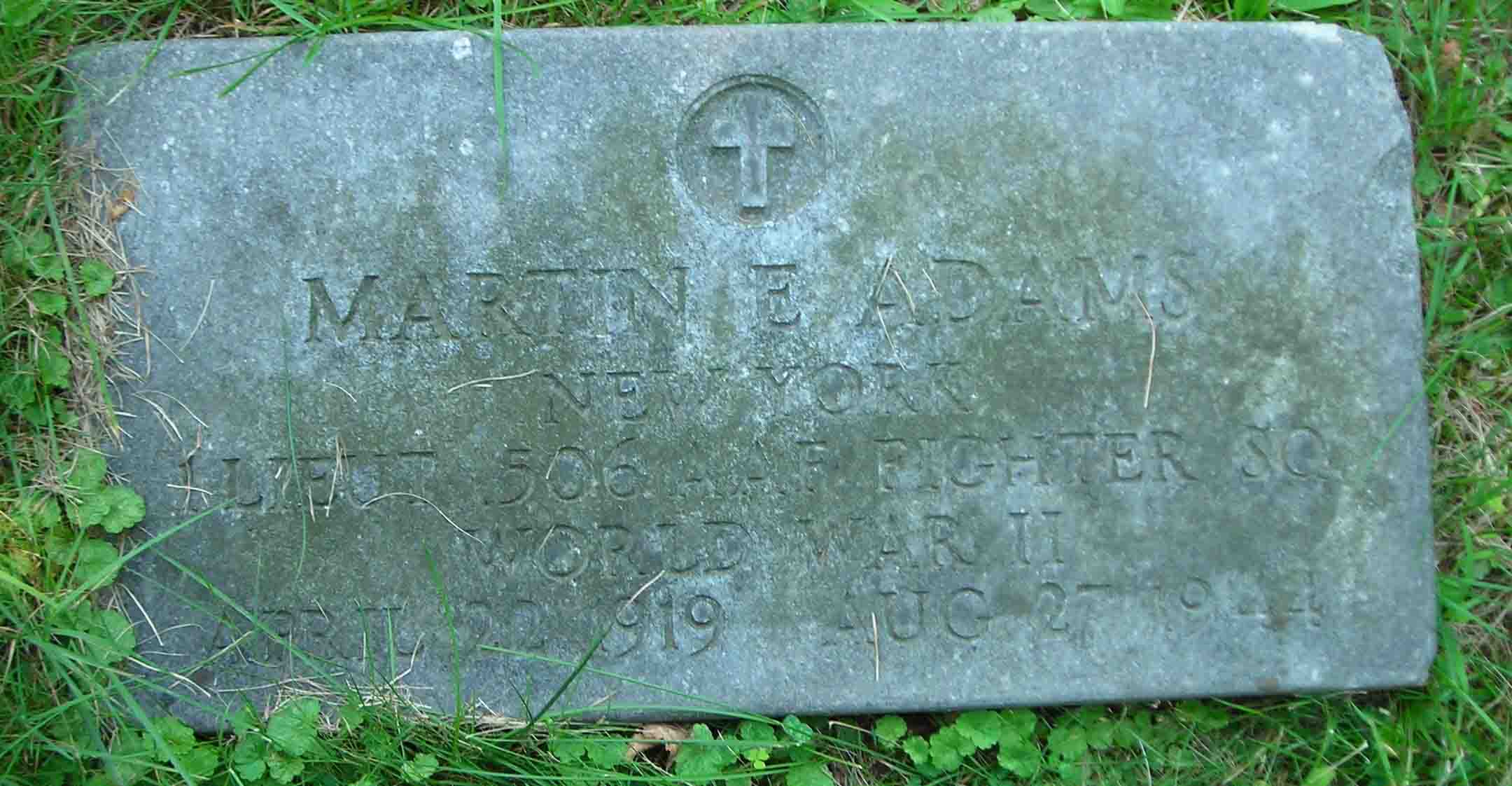 Martin served as a First Lieutenant and Pilot on P-47D #42-28449 in the 506th Fighter Squadron, 404th Fighter Group during World War II. On August 27, 1944, 1Lt Adams took off from A-5 'Chipelle' airfield in Cartigny-L'Epinay, France, on a mission to Coulommiers aerodrome. At 2:15 PM, he was shot down in a dogfight by a fighter and crashed towards Lizy-Sur-Ourcq. 1Lt Adams was killed in the crash. He is now buried in the Cold Spring Cemetery, Cold Spring, Putnam County, New York, USA.
