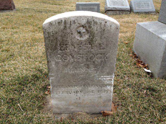Ernest served in the Transportation Corps as a Corporal during World War I. He was killed in Issoudun, France, on February 24, 1919. He was one of the 171 American servicemen who trained at the Third Aviation Instruction Center in France and died between 1917-1919. Cpl Comstock is now buried in the Elm Lawn Memorial Park, Elmhurst, DuPage County, Illinois, USA.