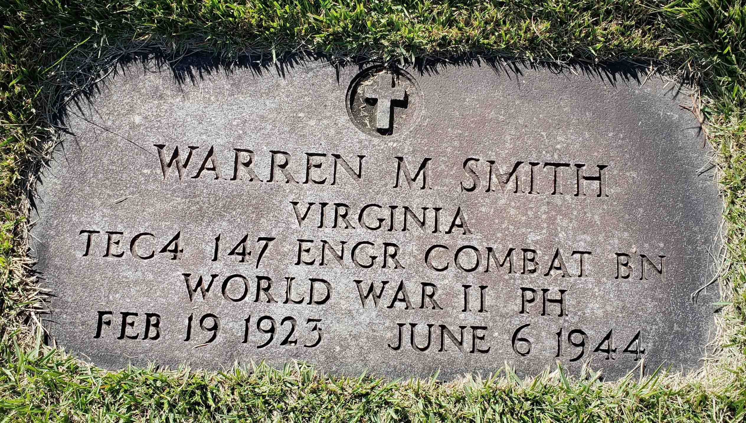 Prior to his entry into the service, Warren was an employee of the Virginia Dairy Company of Richmond. He served as a Technician 4th Grade in the Headquarters & Service Company, 147th Engineer Combat Battalion, during World War II. He was Killed in Action on June 6, 1944, on the Normandy beachhead and is now buried in the Berea Baptist Church Cemetery, Rockville, Hanover County, Virginia, USA.