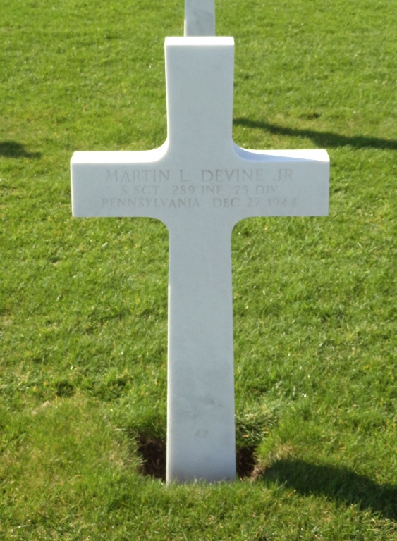 Martin L. Devine, Jr. was born on July 23, 1916, in Pittsburgh, Allegheny County, Pennsylvania. He served in the 289th Infantry Regiment, 75th Infantry Division, as a Staff Sergeant during World War II. He was Killed in Action on December 27, 1944, in Sadzot, Belgium, and is now buried in the Henri-Chapelle American Cemetery, in Hombourg, Belgium. His name is commemorated on a plaque located in the Manhay History 44 Museum, Manhay, Belgium, but he is listed under December 28 casualties.