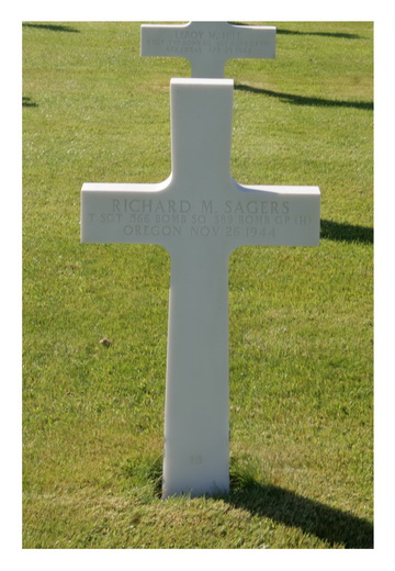TSgt Sagers was Killed in Action and is now buried in the Ardennes American Cemetery and Memorial, Neuville-en-Condroz, Arrondissement de Liège, Liège, Belgium. He also has a cenotaph in the Idlewilde Cemetery, Hood River, Hood River County, Oregon, USA.