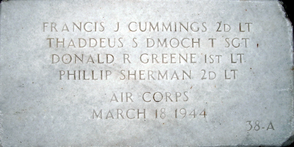T/Sgt Thaddeus S. Dmoch was the radio operator for the 576th Bomber Squadron aircraft. He died in the crash. He is in the same grave with 2LT Cummings, 1Lt Greene, and 2Lt Sherman.