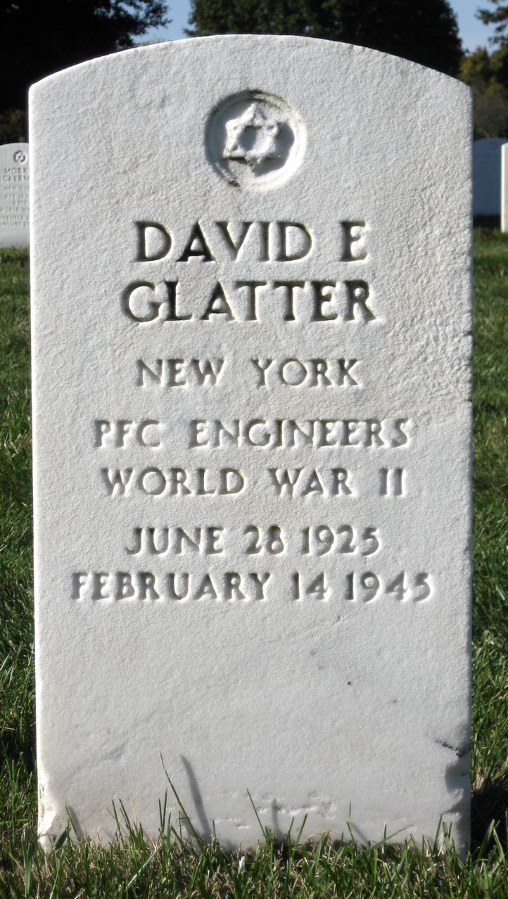 David E. Glatter was born on June 28, 1925. He served in the 1255th Combat Engineer Battalion as a Private First Class during World War II. He died on February 14, 1949 at the age of 19 and is now buried in the Long Island National Cemetery, East Farmingdale, Suffolk County, New York, USA.