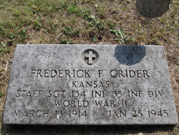 Frederick F. Crider was born on March 13, 1914. He was the son of Frank Hycen Crider and Mary Chipman Doryland Crider. He served in the 134th Infantry Regiment, 35th Infantry Division as a Staff Sergeant during World War II. He was killed in the Battle of the Bulge with eleven other men in his company as they struggled forward in deep snow under heavy and accurate German gunfire during the liberation of Weiswampach in northern Luxembourg. He is now buried in the Highland Cemetery, Junction City, Geary County, Kansas, USA at the age of 30.