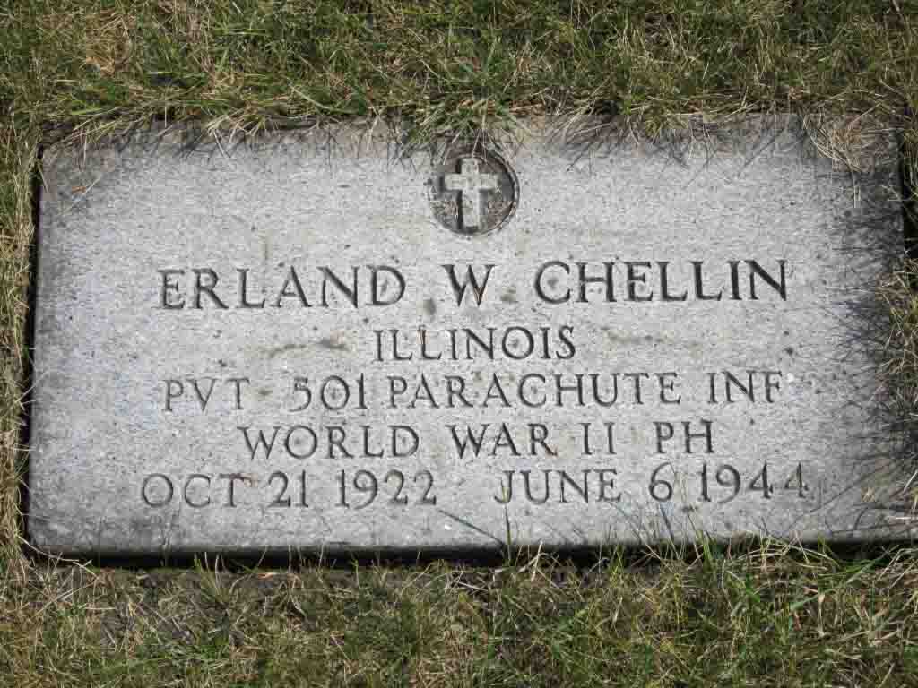 Pvt Erland W. Chellin, paratrooper of the 3/501st PIR’s G Company, took off from station 474 in Welford, UK in C-47 43-30734 to drop with 16 other paratroopers over DZ-C as part of Operation Albany during the Normandy invasion. Their target time was 0120. Their plane was the last of five waves to cross the Cotentin, over air defenses now on full alert. To complicate matters, there were heavy clouds at 1500 feet, gone unreported due to the strict radio silence. Some pilots decided to pull up and find their DZs with the Eureka-Rebecca system, others went low to obtain a visual of their DZs, and a rare few stayed the course through the cloud bank. While approaching DZ-C, flak hit the last three planes, including the 43-30734, no doubt killing the navigator. Another shell exploded in the tail section, throwing the entire stick, already attached to the static line, to the ground. Some were wounded, others not. The order was given to jump. Two soldiers made it out before the plane went into a nosedive, flames engulfing the aircraft. Pvt Morin clambered over the dozen bodies of his comrades to hurl himself out of the plane, seeing it crash 250m away before landing with a twisted ankle. Only two other paras survived.