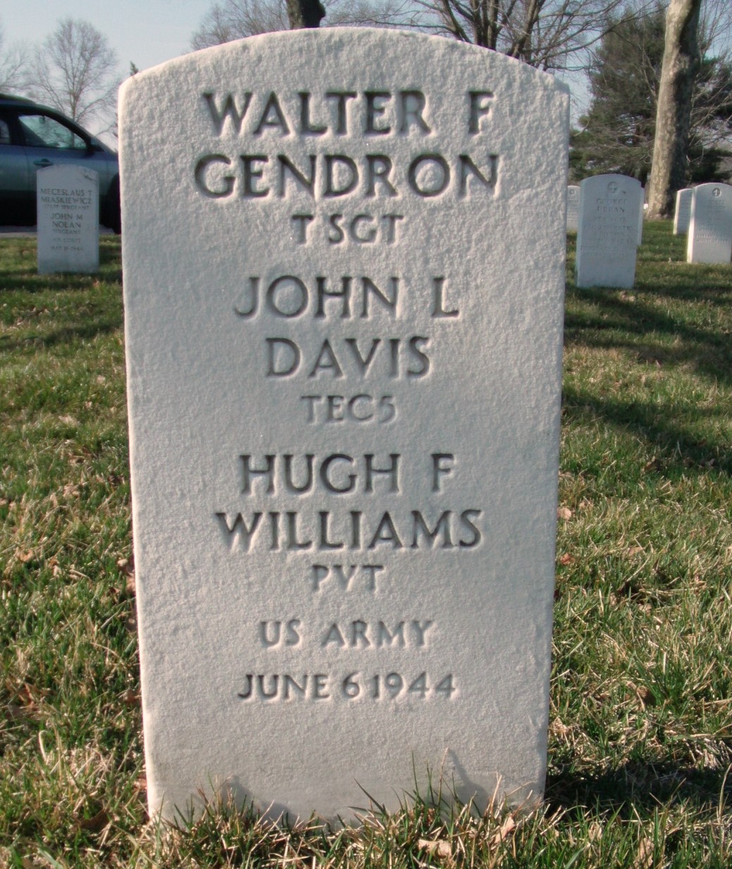 TSgt Walter F. Gendron, crew chief of the C-47 42-100819, took off from Upottery, East Devon, UK to drop 16 paratroopers over DZ-C as part of Operation Albany during the Normandy invasion. Their target time was 0114. To complicate matters, there were heavy clouds at 1500 feet, gone unreported due to the strict radio silence. Some pilots decided to pull up and find their DZs with the Eureka-Rebecca system, others went low to obtain a visual of their DZs, and a rare few stayed the course through the cloud bank. While approaching DZ-C, flak hit the plane, sending it crashing in flames before any of the paras had a chance to jump. His remains were never identified, and he is buried with Pvt Williams and T/5 Davis.