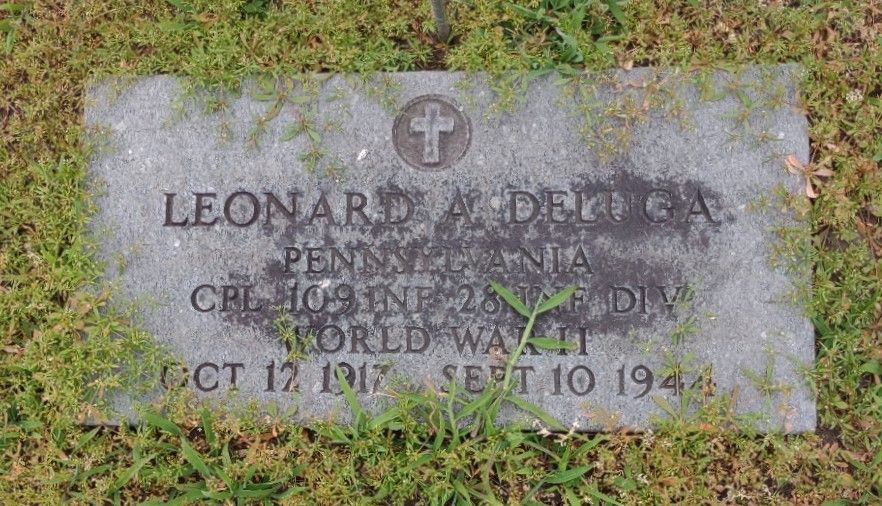 Leonard Deluga is remembered at a memorial in Eschweiler, Luxembourg, where he fell in battle serving with the 109th Infantry Regiment, 28th Infantry Division. He was killed along with 1LT Jesse Sweat.