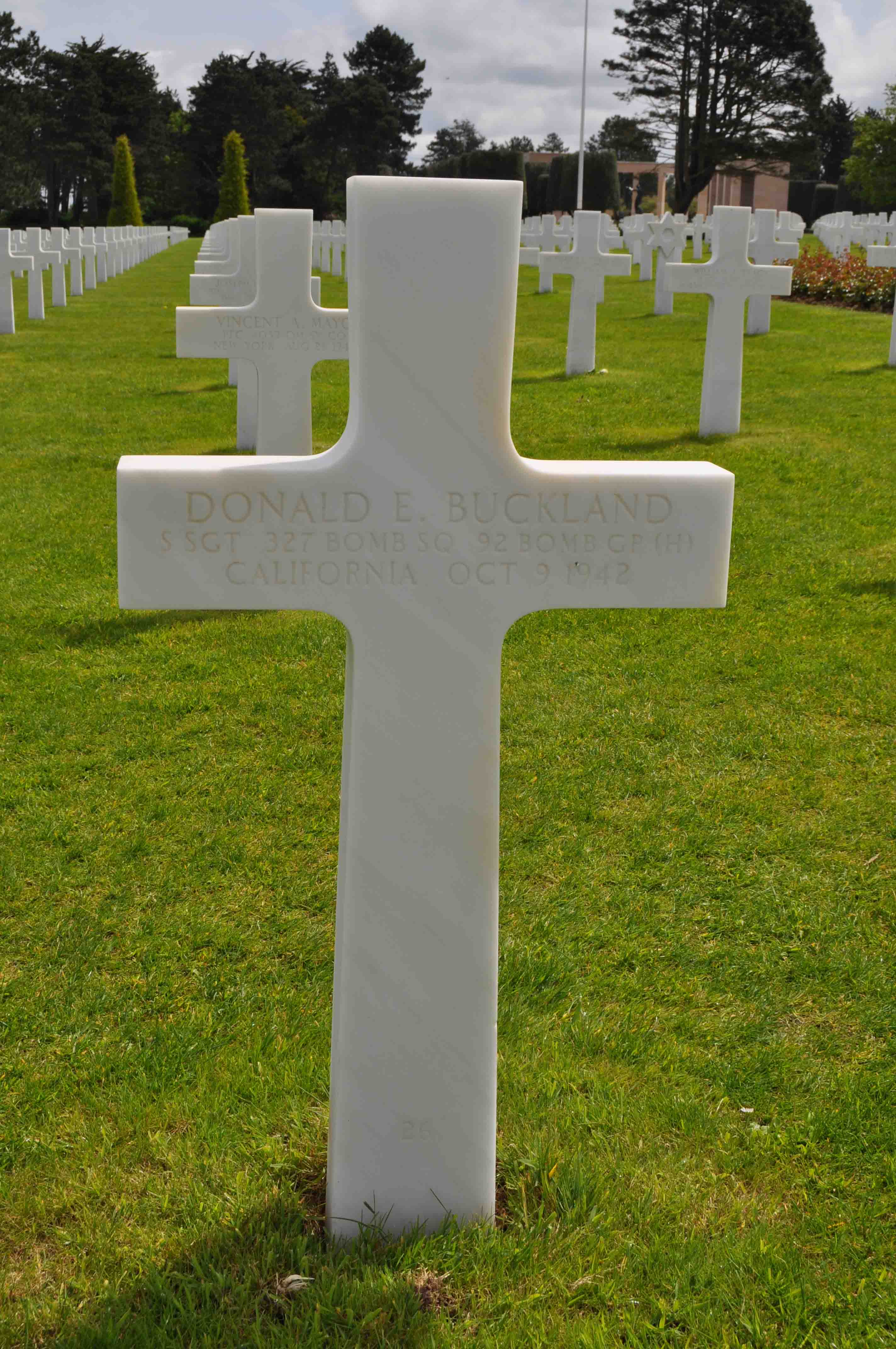 SSgt Donald Edgar Buckland, radio operator of the B-17 41-9018, took off from Bovingdon, Hertfordshire, UK at 0900 on a bombing mission over Hellemmes’ railroad installations. They were hit by German AA fire, causing them to drop out of formation and be hounded by nine German Fw-190s. The latter shot off the tail section, sending the plane down. The pilot held on as long as he could to avoid hitting the residential areas, but finally had to bail out. His parachute malfunctioned and he plummeted to his death. Several other airmen, including SSgt Buckland, died with the plane.