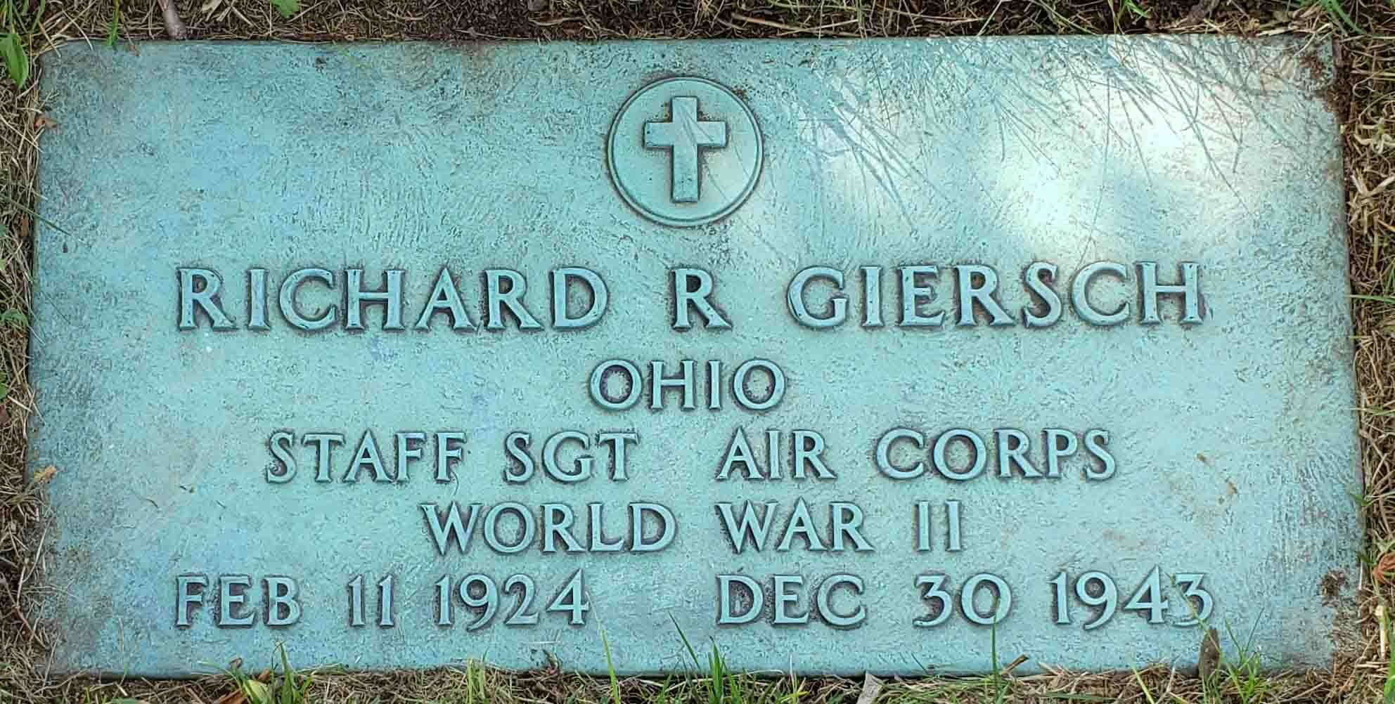 SSgt Richard R. Giersch, mechanic of the B-17 42-29963 “Judy”, took off from station 117 Kimbolton, Cambridgeshire, UK at 0730 on a bombing mission over Ludwigshafen and Solingen. The plane’s no.1 engine suffered a direct flak hit right after bombs away. Wounded, the bomber was harassed by enemy fighters until part of the crew managed to bail out at 1259. SSgt Giersch jumped at too low an altitude.