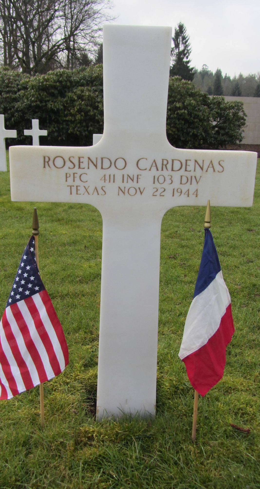 Rosendo Cardenas was born on January 13, 1919 in Gonzales, Texas. He was the son of Gaspar Cardenas and Petra Garcia Cardenas. Rosendo enlisted in Houston, Harris County, Texas, on July 14, 1941. He resided in Fort Bend County, Texas at the time of his enlistment and listed his occupation as farm hand. He served in the 411th Infantry Regiment, 103rd Infantry Division as a Private First Class during World War II. PFC Cardenas was Killed in Action on November 22, 1944 at the age of 25 in the battle for Saulcy-sur-Meurthe, France and is now buried in the Epinal American Cemetery, Dinozé, France.