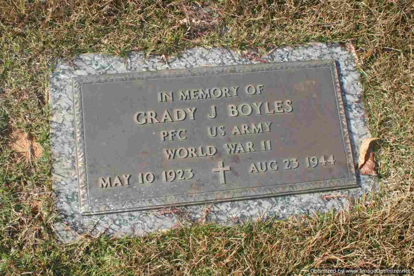 Grady J. Boyles was born on May 10, 1923. He served in the U.S. Army during World War II as a Private First Class. He entered service in Alabama. He died on August 23, 1944 during the invasion of southern France. He is now buried at Duncan Creek Cemetery, Franklin County, Alabama, USA.