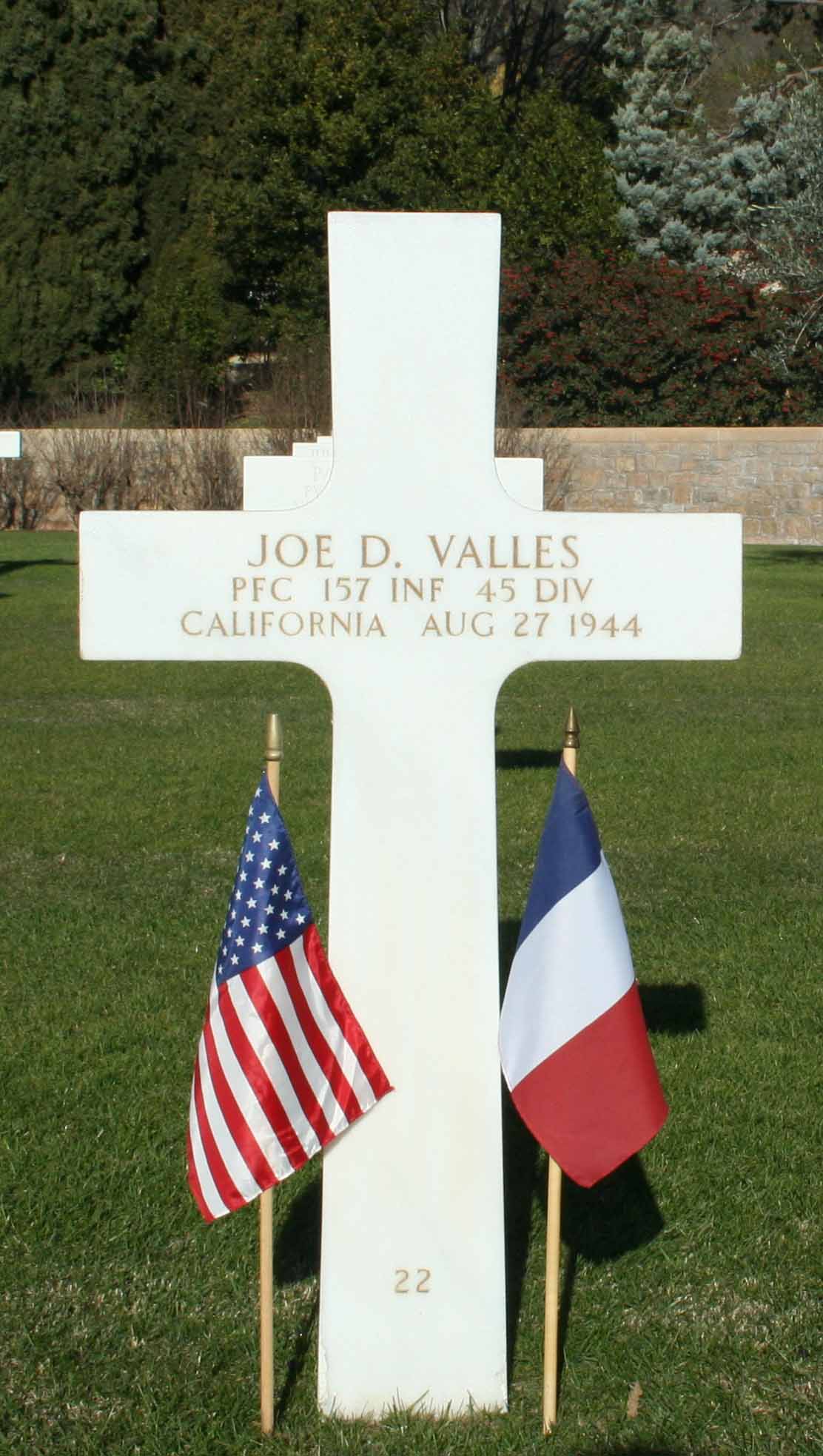 Joe D. Valles served in the U.S. Army during World War II as a Private First Class in the 157th Infantry Regiment, 45th Infantry Division. He entered service in California. He died on August 27, 1944 during the invasion of southern France. He is now buried at Rhone American Cemetery and Memorial, Draguignan, Departement du Var, Provence-Alpes-Côte d'Azur, France.