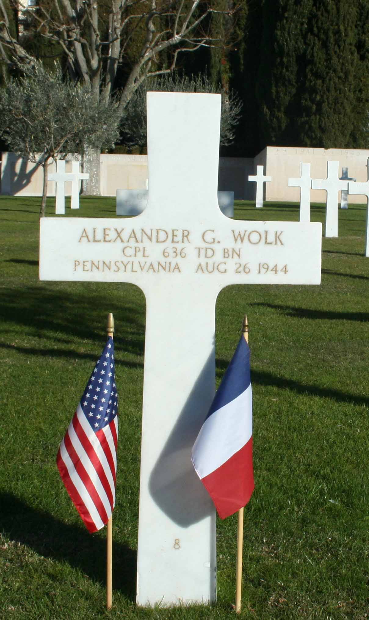 Alexander G. Wolk served in the U.S. Army during World War II as a Corporal in the 636th Tank Destroyer Battalion. He entered service in Pennsylvania. He died on August 26, 1944 during the invasion of southern France. He is now buried at Rhone American Cemetery and Memorial, Draguignan, Departement du Var, Provence-Alpes-Côte d'Azur, France.