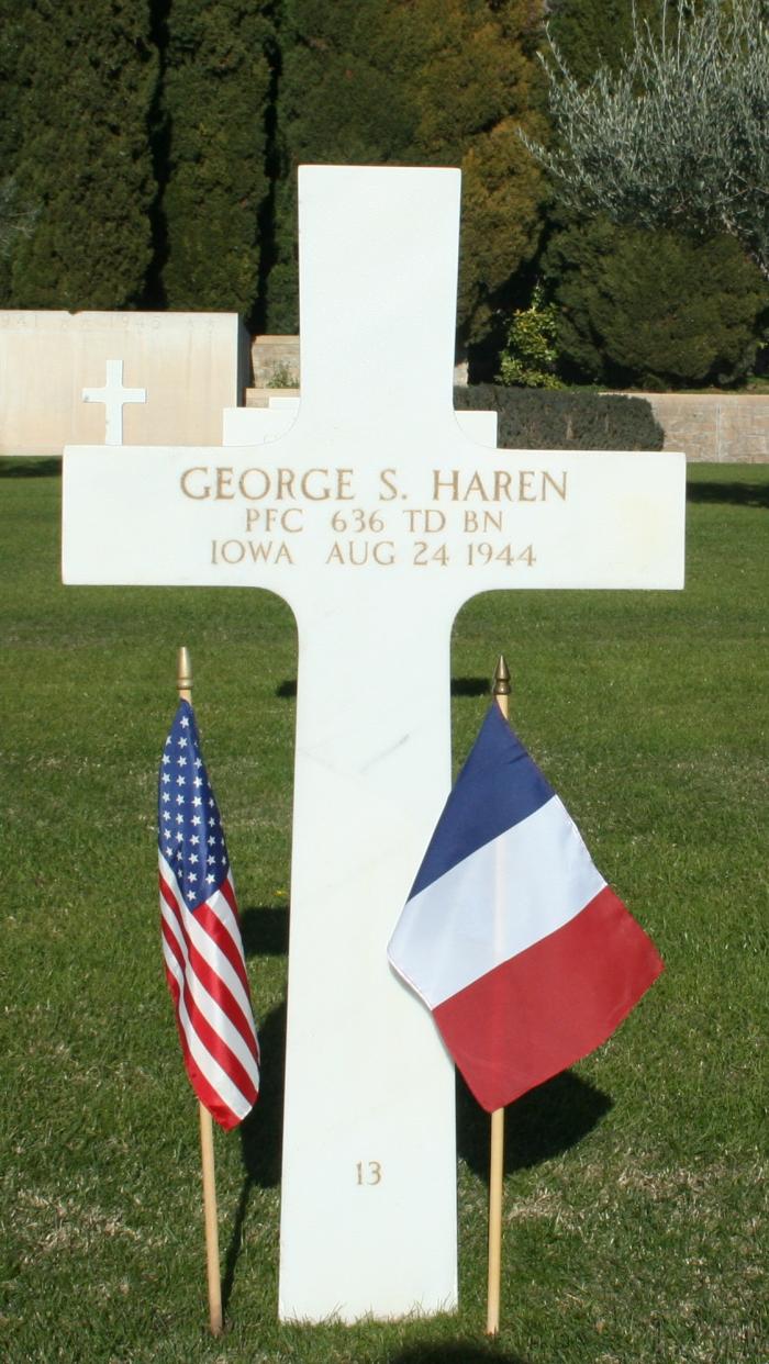 George Sherman Haren served in the U.S. Army during World War II as a Private First Class in the 636th Tank Destroyer Battalion. He entered service in Iowa. He died on August 24, 1944 during the invasion of southern France. He is now buried at Rhone American Cemetery and Memorial, Draguignan, Departement du Var, Provence-Alpes-Côte d'Azur, France.