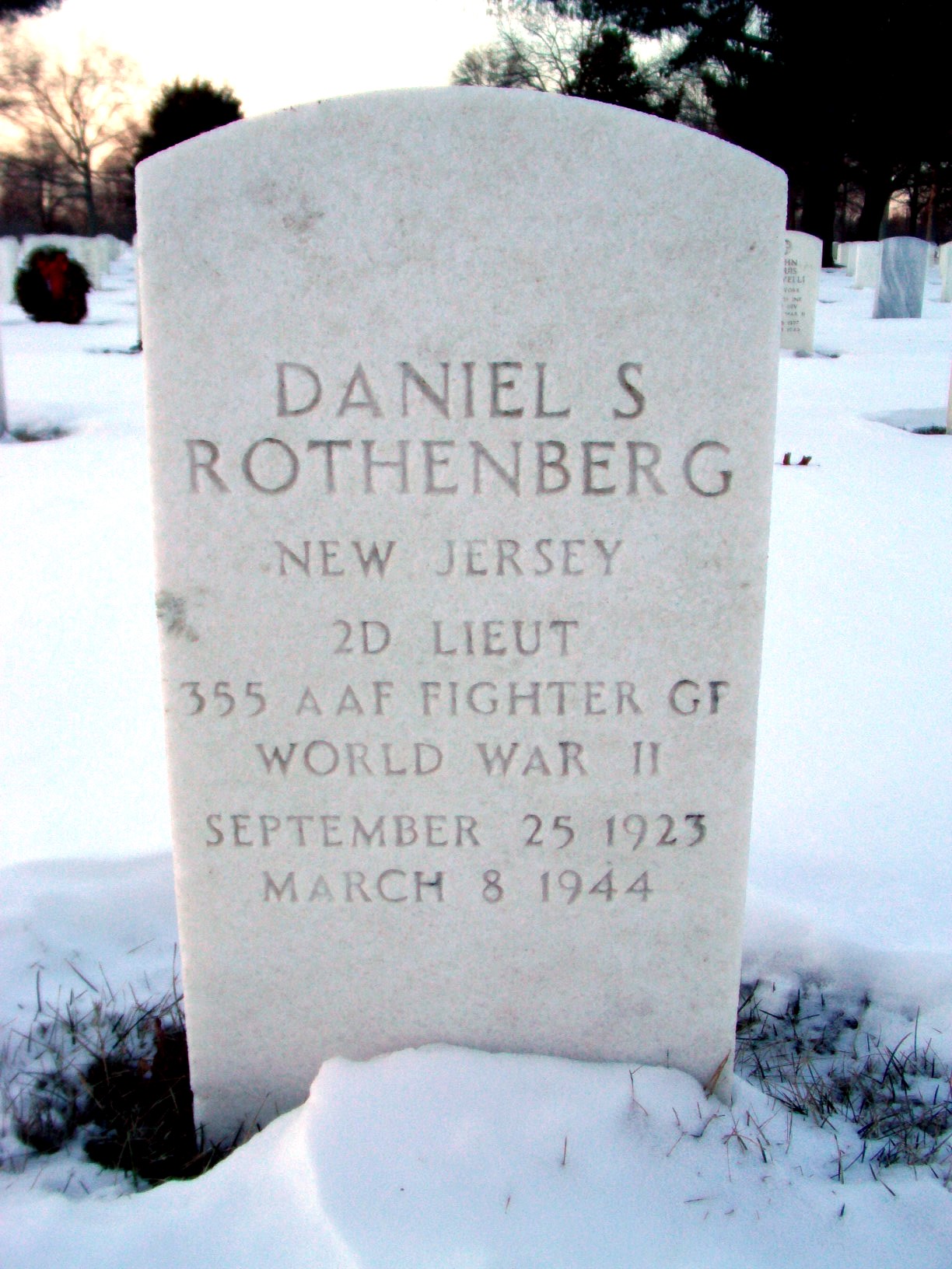 Daniel S. Rothenberg was born on January 25, 1923. 2Lt Rothenberg was assigned to the 357th Fighter Squadron, 355th Fighter Group in 1944. He was killed in action on March 8, 1944, flying his P-51B (43-6989). He was last seen chased by Fw 190s. He is now buried in Long Island National Cemetery, East Farmingdale, Suffolk County, New York, USA.