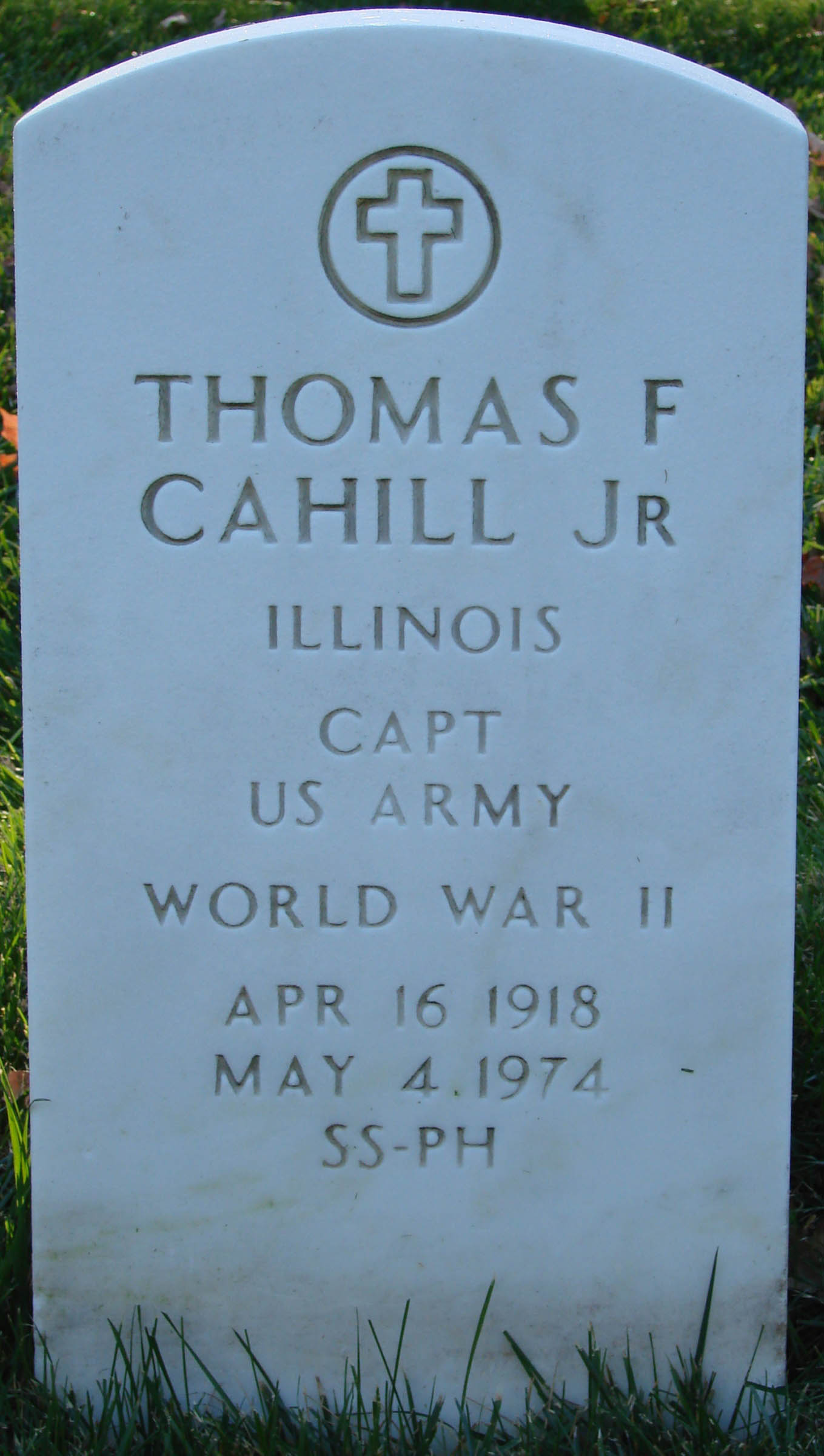Thomas F. Cahill was born on April 16, 1918. He served in the U.S. Army during Normandy Invasion of World War II as a Second Lieutenant in C Company, 502nd Parachute Infantry Regiment, 101st Airborne Division. He entered the service in Illinois. He ended his military service as a Captain. He died on May 4, 1974 and is now buried in Arlington National Cemetery, Arlington, Arlington County, Virginia, USA.
