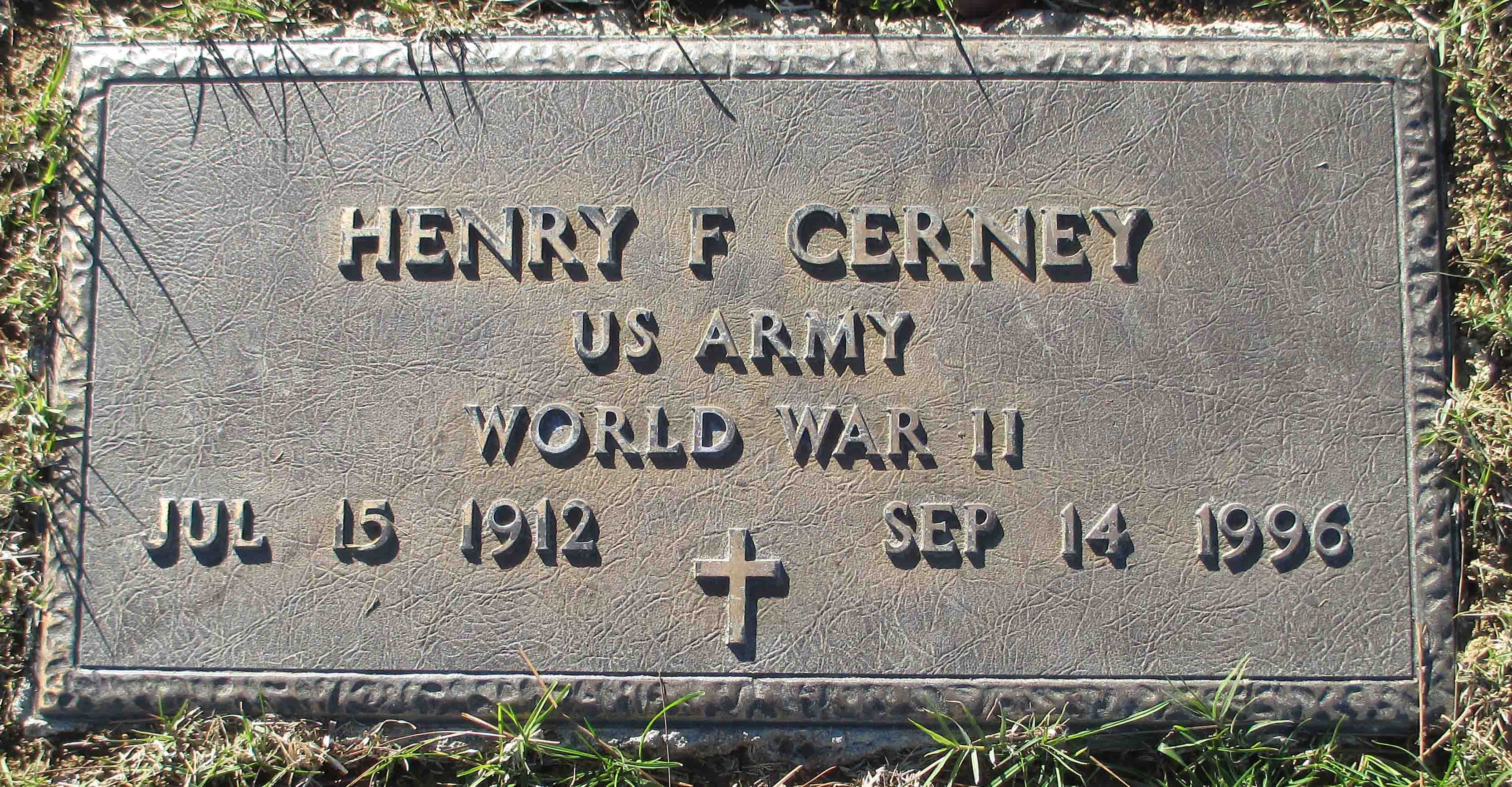 Henry Cerney was born on July 15, 1912. He served in the U.S. Army during the Normandy Invasion of World War II as a Sergeant in D Company, 377th Parachute Infantry Regiment, 101st Airborne Division. He entered the service in Indiana. He died on September 14, 1996 and is now buried in Forest Lawn Memorial Park, Glendale, Los Angeles County, California, USA.