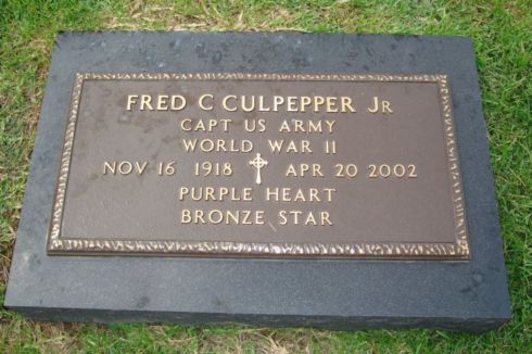 Fred Carroll Culpepper, Jr. was born on November 16, 1918. He served in the U.S. Army during the Normandy Invasion of World War II as a Captain in D Company, 377th Parachute Infantry Regiment, 101st Airborne Division. He died on April 20, 2002 and is now buried in Riverview Cemetery, Monroe, Ouachita Parish, Louisiana, USA.