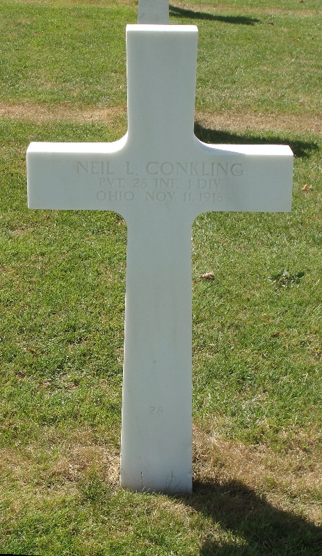 When Neil L. Conkling was born on July 14, 1890, in Garrettsville, Ohio, his father, Austin, was 38 and his mother, Hattie, was 36. He had one sister. He served in the U.S. Army during the World War I as a Private in M Company, 28th Infantry Regiment, 1st Infantry Division. He died on November 11, 1918 and is now buried in Meuse-Argonne American Cemetery and Memorial, Romagne-sous-Montfaucon, Departement de la Meuse, Lorraine, France. He also has a marker in Spring Grove Cemetery, Medina, Medina County, Ohio, USA.