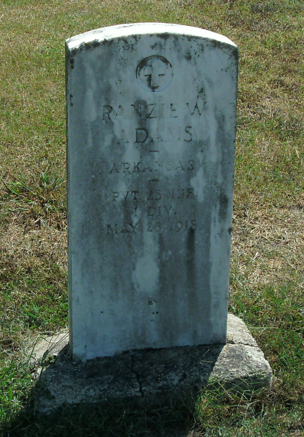 Ranzie W. Adams served in the U.S. Army during World War I as a Private in Company D, 28th Infantry Regiment, 1st Infantry Division. He died on May 28, 1918 and is now buried in Browns Chapel Cemetery, Paragould, Greene County, Arkansas, USA.