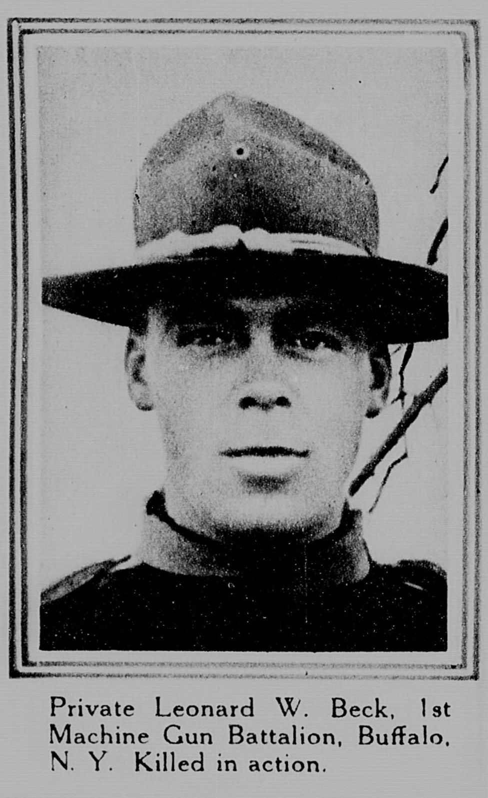 Leonard W. Beck entered the military service in New York. He served in the U.S. Army during World War I as a Private in Company A, 1st Machine Gun Battalion, 1st Infantry Division. He was declared "Missing in Action" on June 7, 1918 and is commemorated on Tablets of the Missing, Somme American Cemetery, Bony, France. He also has a marker in Buffalo Cemetery, Cheektowaga, Erie County, New York, USA.