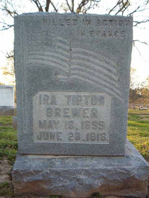 Ira Tipton Brewer was born on May 18, 1899. He served in the U.S. Army during World War I as a Wagoneer in Supply Company, 18th Infantry Regiment, 1st Infantry Division. He died on June 28, 1918 and is now buried in Fairview Cemetery, Dyersburg, Dyer County, Tennessee, USA.