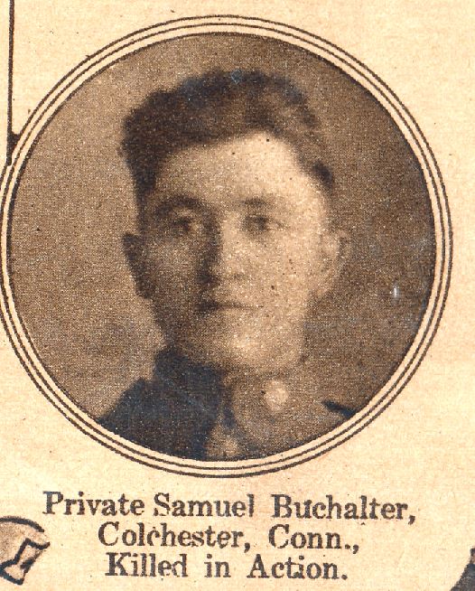 Samuel Buchalter was born on January 1, 1894. H e was the son of Nathan and Rebecca Litshitsky. He served in the U.S. Army during World War I as a Private in Company D, 26th Infantry Regiment, 1st Infantry Division. He died on May 29, 1918 and is now buried in Ahavath Achim Memorial Park, Colchester, New London County, Connecticut, USA.