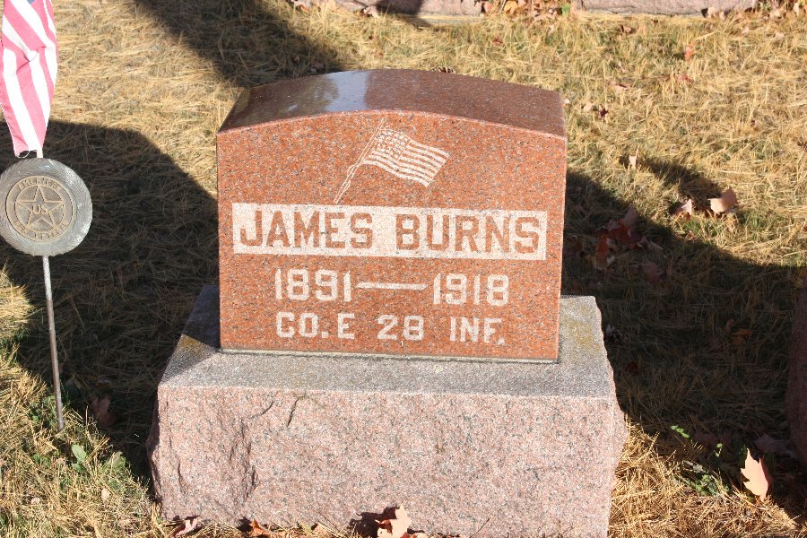 When James Andrew Burns was born on December 18, 1891, in Wausau, Wisconsin, his father, Patrick, was 31 and his mother, Katherine, was 24. He married Mary Catherine Givney in 1916. They had one child during their marriage. He served in the U.S. Army during World War I as a Private in Company E, 28th Infantry Regiment, 1st Infantry Division. He died on May 24, 1918 and is now buried in Saint Joseph Cemetery, Wausau, Marathon County, Wisconsin, USA.