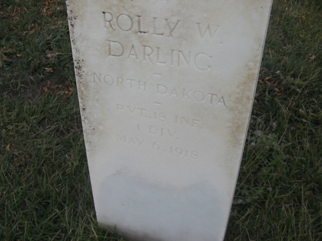 When Rolly Winchester Darling was born on September 14, 1890, in Radcliffe, Iowa, his father, Montroville, was 35 and his mother, Mary, was 19. He had four brothers and three sisters. He served in the U.S. Army during World War I as a Private in Company B, 18th Infantry Regiment, 1st Infantry Division. He died on May 6, 1918 and is now buried in Wild Rose Cemetery, Berthold, Ward County, North Dakota, USA.