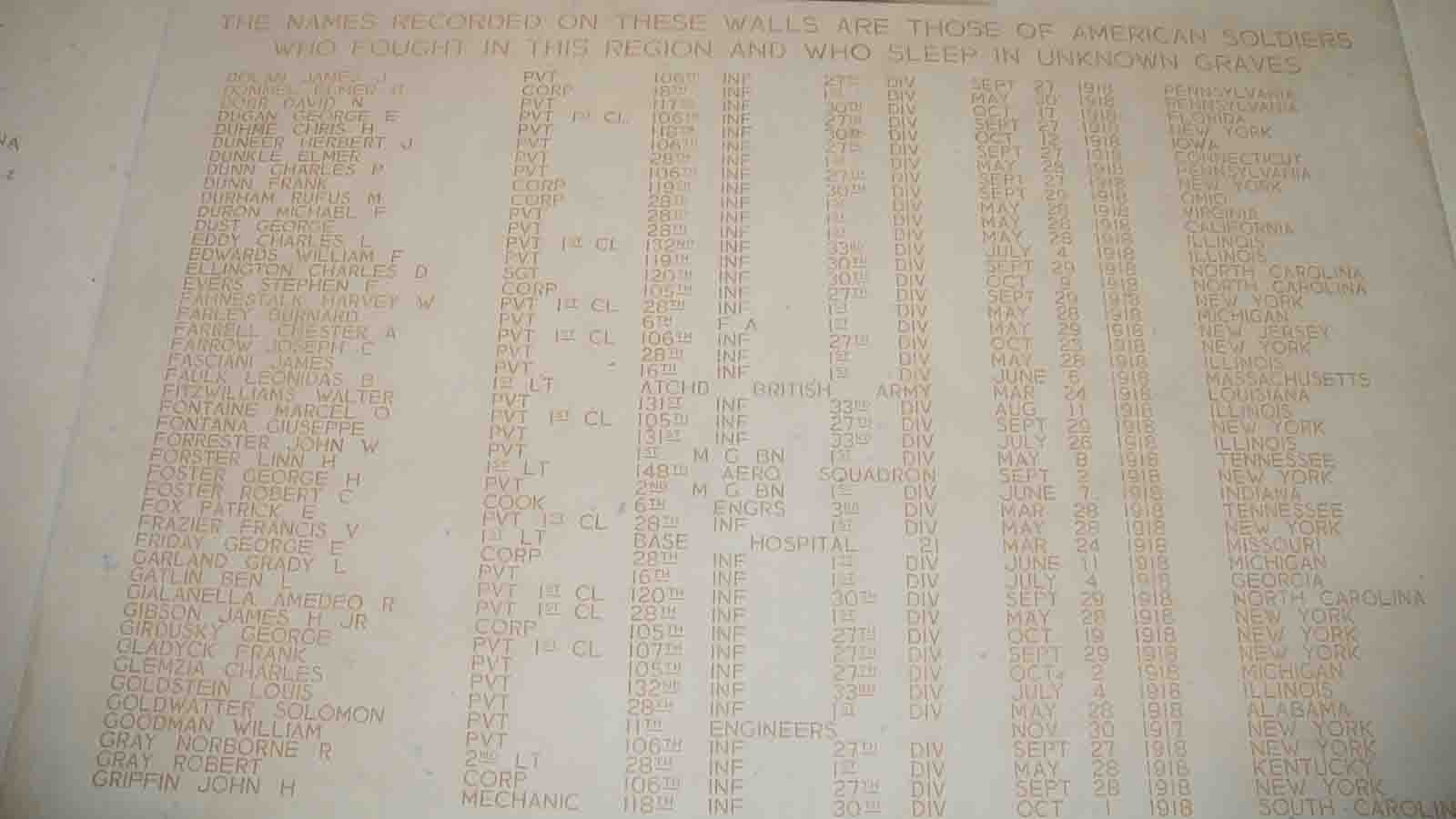 Elmer Dunkle entered the military service in Pennsylvania. He served in the U.S. Army during World War I as a Private in Company D, 28th Infantry Regiment, 1st Infantry Division. He was declared "Missing in Action" on May 28, 1918 and is commemorated on Tablets of the Missing, Somme American Cemetery, Bony, France.
