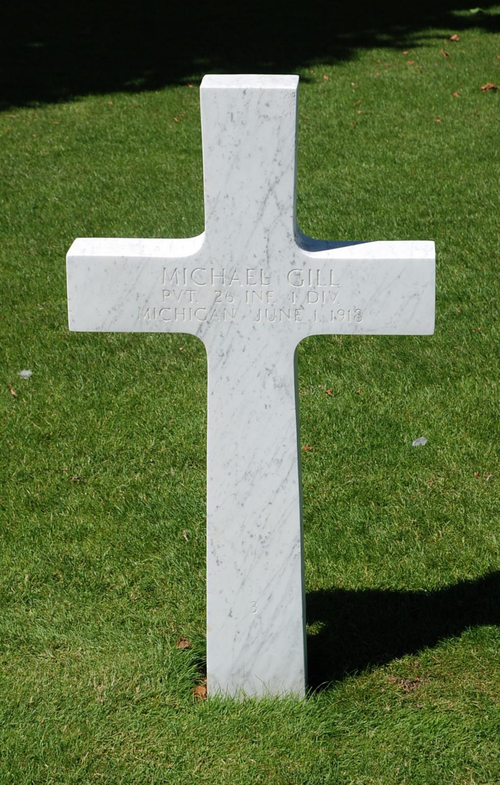 Michael Gill entered the military service in Michigan. He served in the U.S. Army during World War I as a Private in Company B, 26th Infantry Regiment, 1st Infantry Division. He died on June 1, 1918 and is now buried in Somme American Cemetery, Bony, France.
