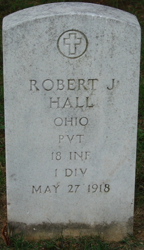 Robert J. Hall served in the U.S. Army during World War I as a Corporal in Company D, 18th Infantry Regiment, 1st Infantry Division. He died on May 27, 1918 and is now buried in Arlington National Cemetery, Arlington, Arlington County, Virginia, USA.