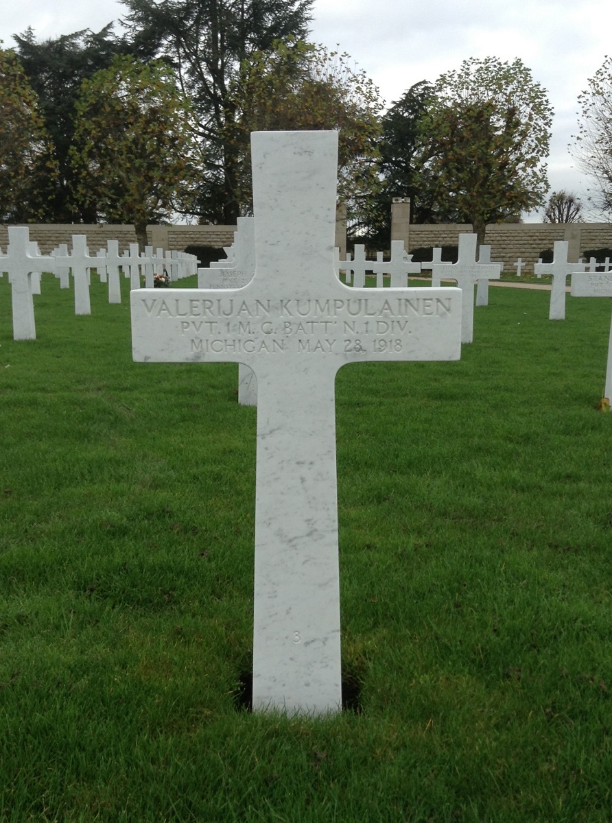 Valerijan Kumpulainen was born on November 3, 1891 in Finland. He entered the military service in Michigan, USA. He served in the U.S. Army during World War I as a Private in Company A, 1st Machine Gun Battalion, 1st Infantry Division. He died on May 28, 1918 and is now buried in Somme American Cemetery, Bony, France.