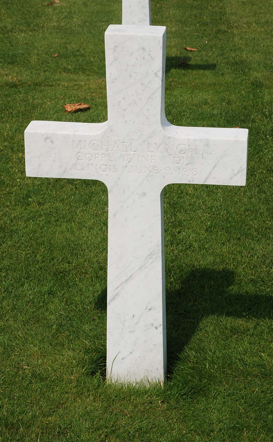 Michael Lynch entered the military service in Illinois. He served in the U.S. Army during World War I as a Corporal in Company D, 18th Infantry Regiment, 1st Infantry Division. He died on June 9, 1918 and is now buried in Somme American Cemetery, Bony, France.