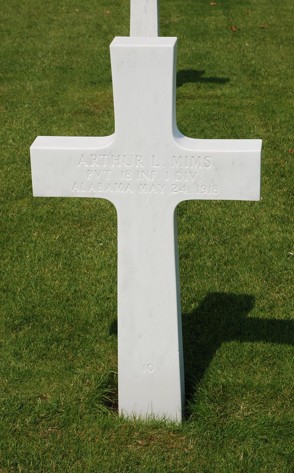 Arthur L. Mims entered the military service in Alabama. He served in the U.S. Army during World War I as a Private in Company D, 18th Infantry Regiment, 1st Infantry Division. He died on May 24, 1918 and is now buried in Somme American Cemetery, Bony, France. His name is inscribed on the Cantigny monument as PVT A L MINUS.