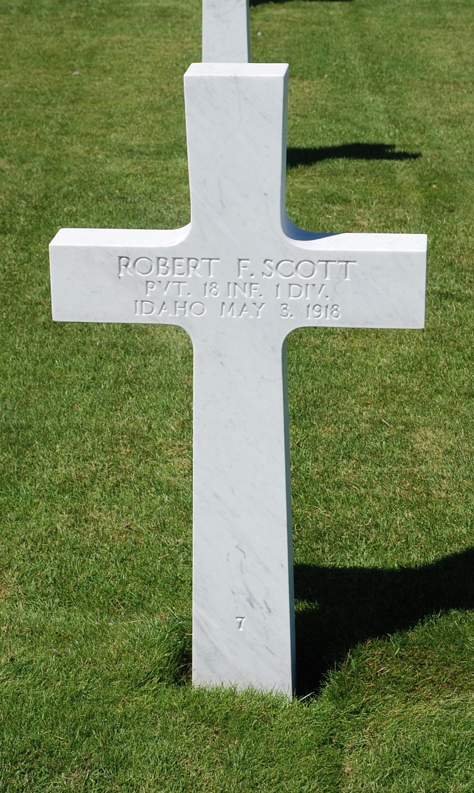 Robert F. Scott entered the military service in Idaho. He served in the U.S. Army during World War I as a Private in Company G, 18th Infantry Regiment, 1st Infantry Division. He was Killed in Action on May 3, 1918 and is now buried in Somme American Cemetery, Bony, France.
