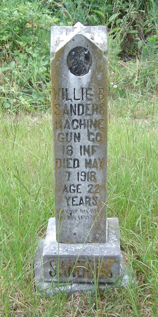 Willie B. Sanders served in the U.S. Army during World War I as a Private in Machine Gun Company, 18th Infantry Regiment, 1st Infantry Division. He was Killed in Action on May 7, 1918 and is now buried in Zion Hill Baptist Church Cemetery, Spartanburg, Spartanburg County, South Carolina, USA. His name is inscribed on the Cantigny monument as PVT W B SNDERS.
