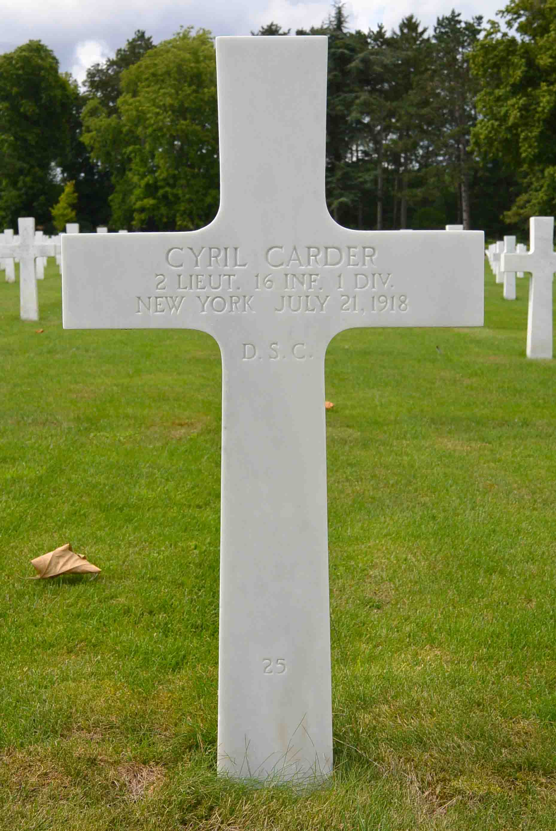 When Cyril Frederick Carder was born on June 6, 1893, in Wordsley, Staffordshire, England, his father, Frederick, was 29 and his mother, Annie, was 29. He had one brother and one sister. He entered the military service in New York. He served in the U.S. Army during World War I as a Second Lieutenant in Company D, 16th Infantry Regiment, 1st Infantry Division. He was Killed in Action on July 21, 1918 and is now buried in Oise-Aisne American Cemetery, Seringes-et- Nesles, France. A cenotaph made for him is located at Hope Cemetery Annex, Corning, Steuben County, New York, USA.
