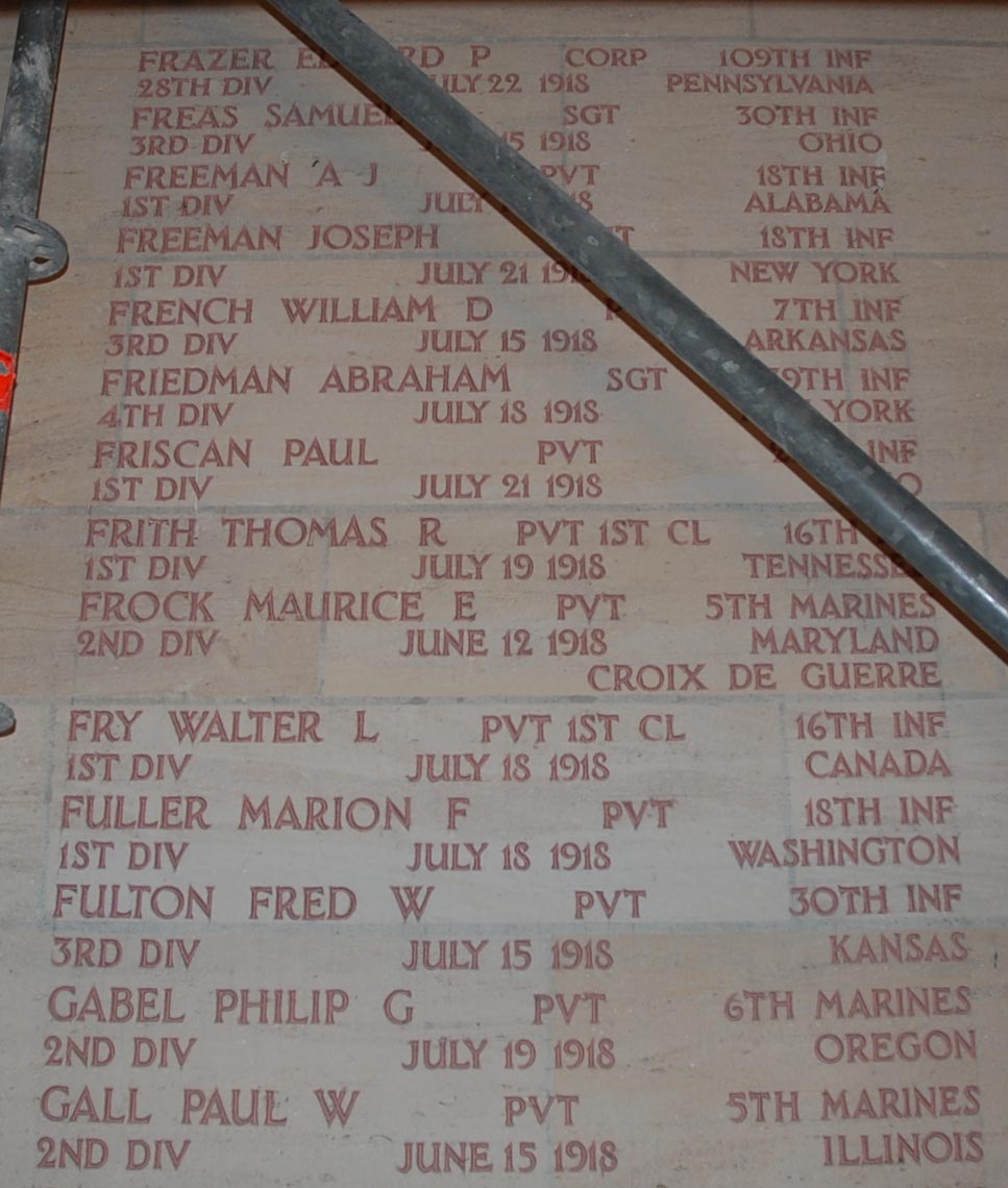Walter L. Fry entered the military service in Canada. He served in the U.S. Army during World War I as a Private First Class in Company F, 16th Infantry Regiment, 1st Infantry Division. He was declared "Missing in Action" on July 18, 1918 and is commemorated on Tablets of the Missing, Aisne-Marne American Cemetery, Belleau, France.