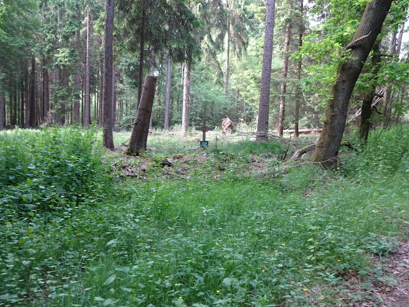 To the west of the town of Hillesheim, at the first dirt road running north along the tree line from highway 421. About 100 meters North along the road the site is to the west. A small cross in the woods along a dirt path