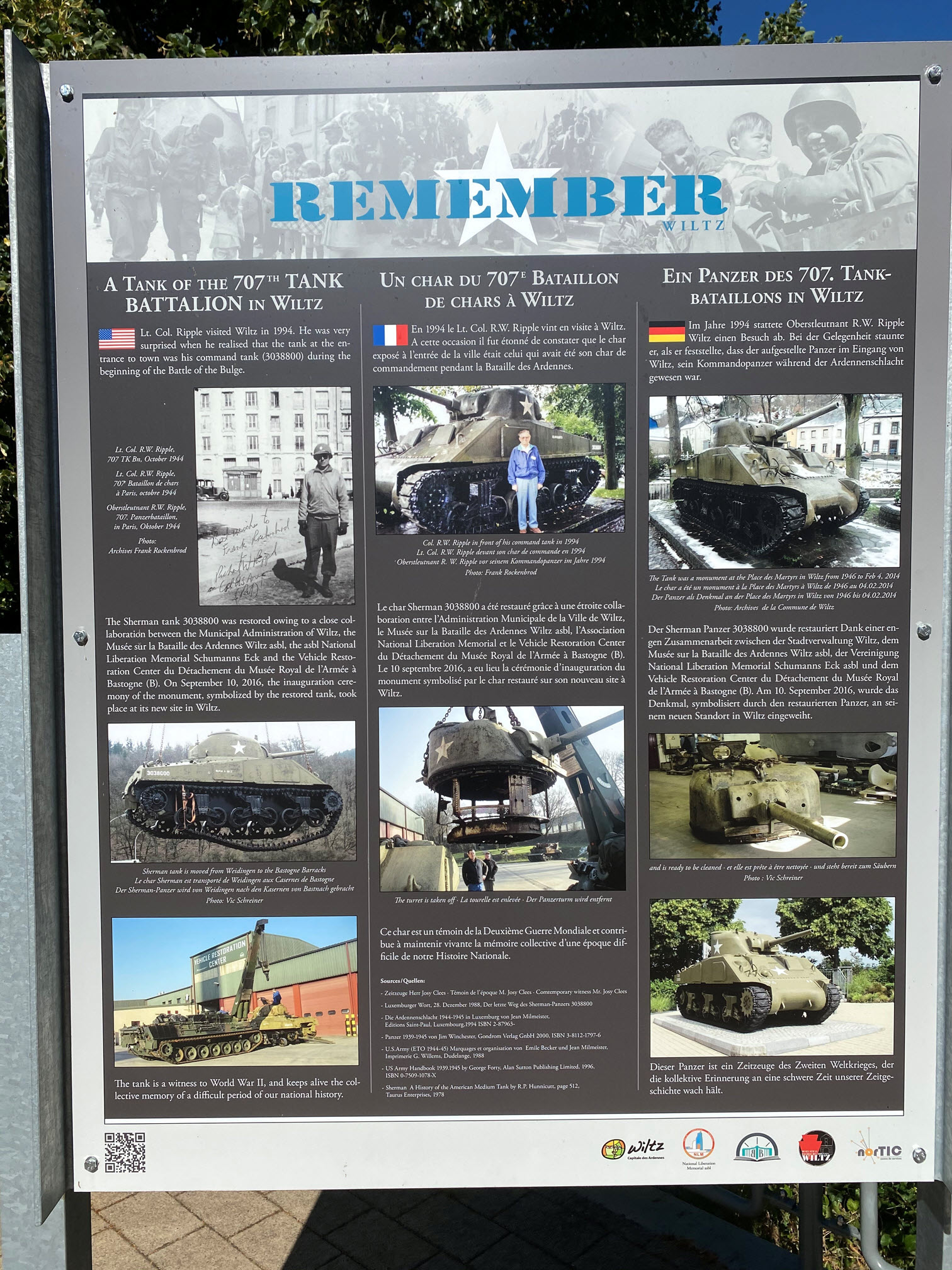 Sherman Tank of the 707th Tank Battalion, three flag poles, and three information panels.