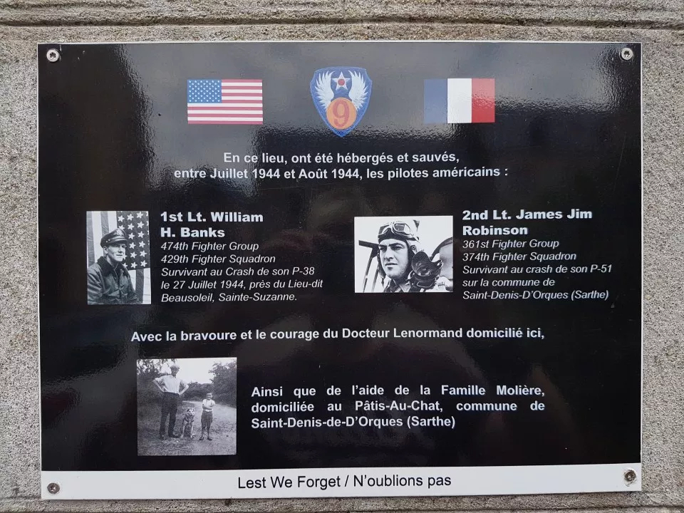 At the gate of the property is a plaque that mentions the rescue of 1Lt William H. Banks and 2Lt James Jim Robinson in World War II.