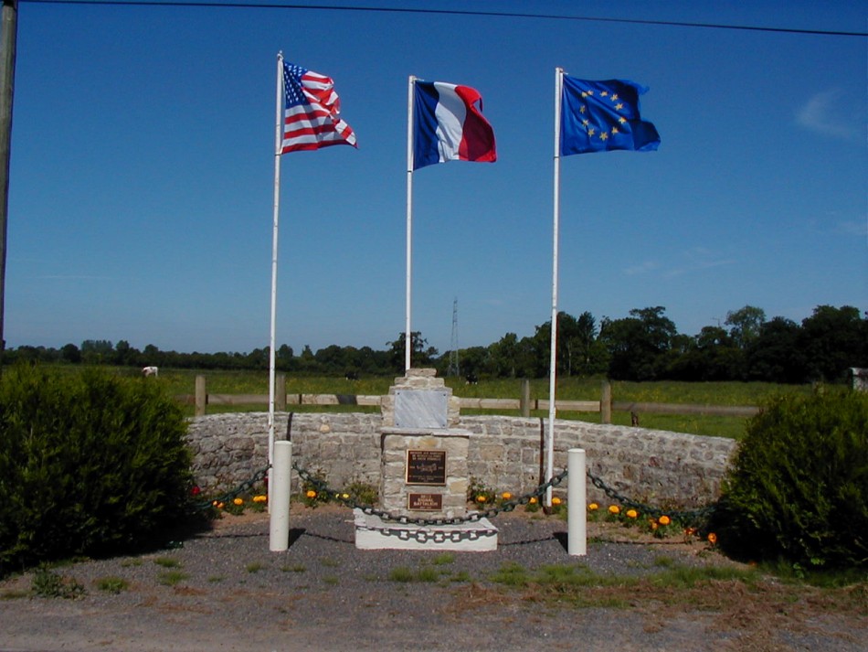 A chained-off monument by the side of the road, flanked by three flagpoles, commemorating an American Fighter Group and the WW2 Airfield located here.