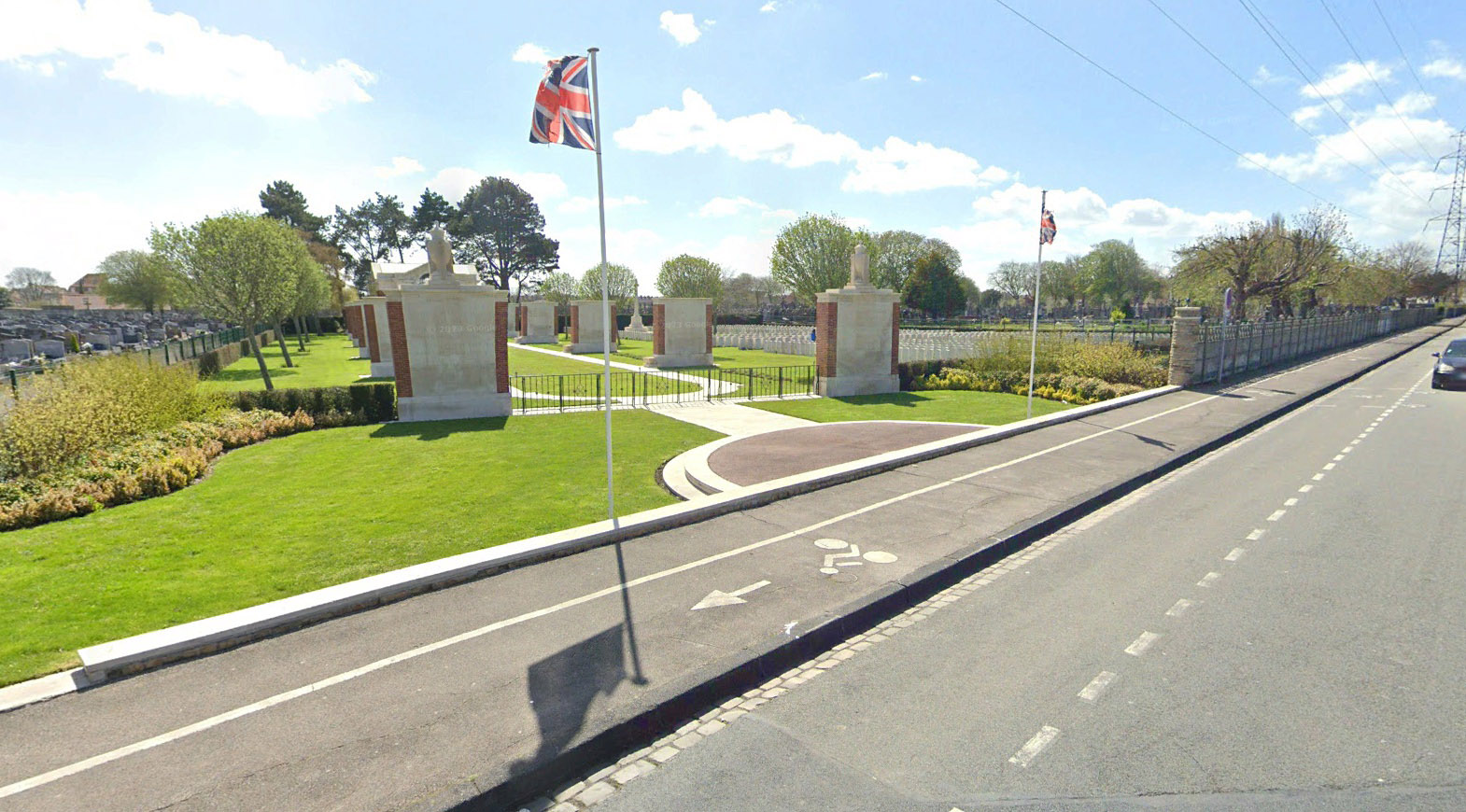 Dunkirk Town Cemetery is at the southeastern corner of the town of Dunkirk, immediately south of the canal and on the road to Veurne (Furnes) in Belgium. On entering the cemetery through the columns of the Dunkirk Memorial, two Commonwealth war graves sections will be seen: Plots IV and V from the First World War and Plots I and II from the Second World War. There is also a further First World War section (Plots I, II, and III) in the main part of the cemetery to the right of the main entrance.
