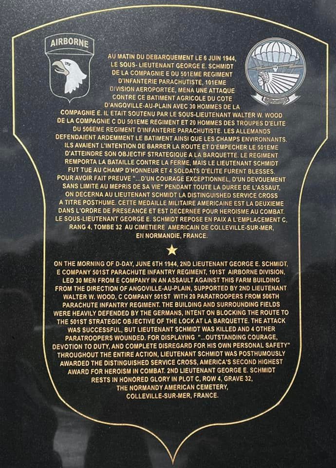 The site has a plaque commemorating Second Lieutenant George E. Schmidt who was Killed in Action in the assault on the nearby farm during World War II. The Ferme Delaunay is significant due to its role during World War II as it was a key location in the D-Day invasion. During the events of June 6, 1944, the farmhouse and its surrounding area were involved in intense combat as American paratroopers from the 101st Airborne Division fought to secure the area against German defenses. The farmhouse was used as a base of operations and a defensive position by the German forces, and it was situated close to the key battlefields where American paratroopers, including those led by 2nd Lieutenant George E. Schmidt, engaged in crucial engagements to secure objectives and disrupt German lines. Today, Ferme Delaunay operates as a Normandy B&B and gîtes (holiday cottages), preserving its historical significance while serving as a place for visitors to stay and explore the rich history of the region. The farmhouse stands as a reminder of the fierce battles fought in the area and the broader context of the D-Day landings.