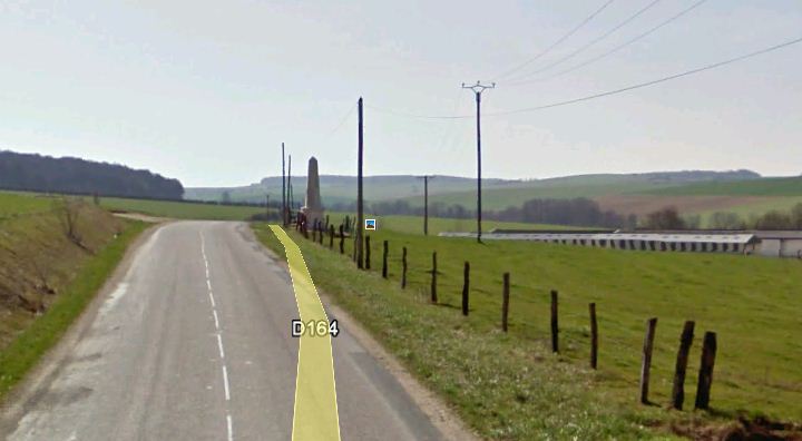 On the southside of the D-164 at its intersection with an unnamed rural road, 1 km SW of Brieulles.