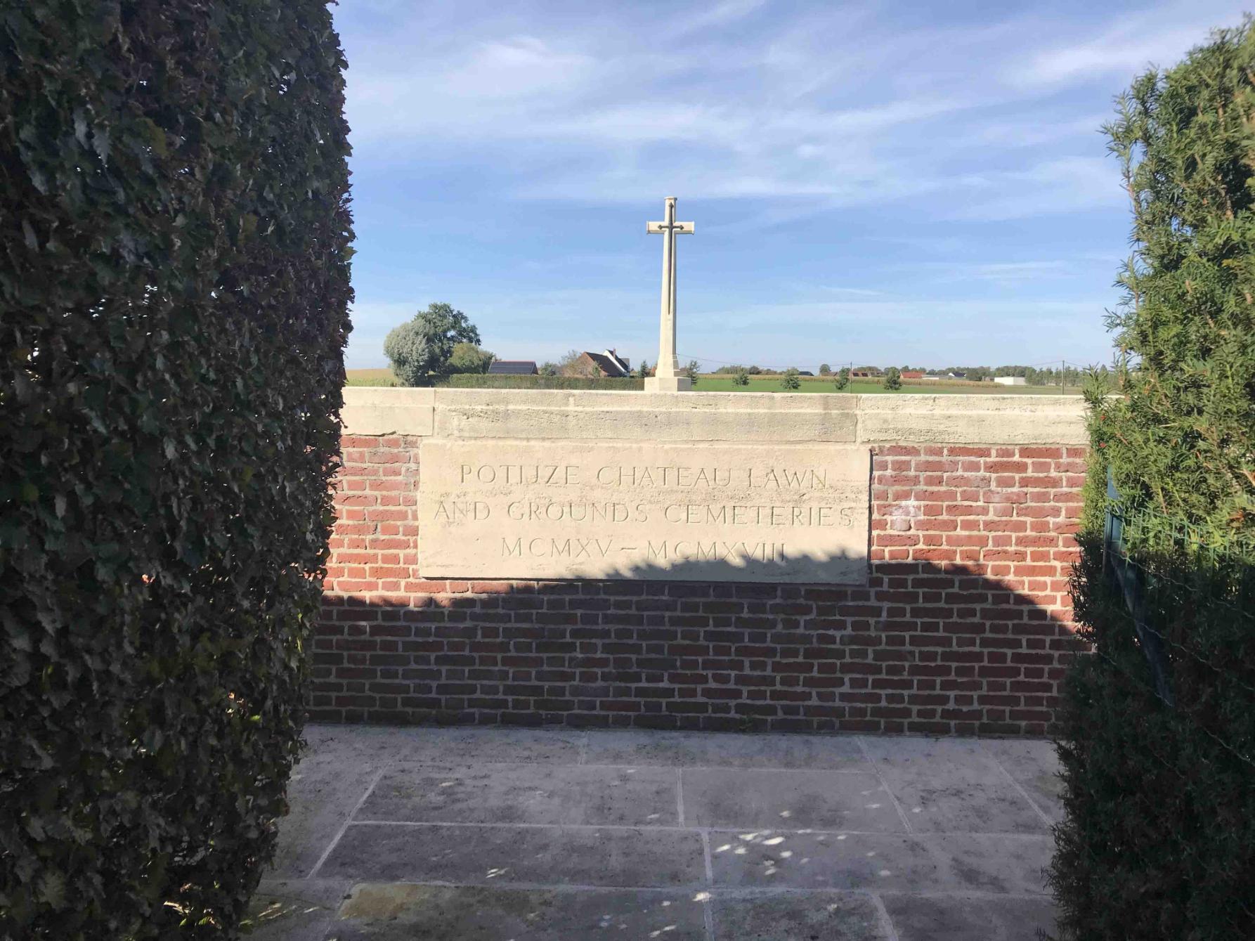 The old chateau grounds at Potijze are the site of three Commonwealth War Graves Commission cemeteries containing over 850 Commonwealth burials of the First World War: Potijze Chateau Grounds, Potijze Chateau Lawn, and Potijze Chateau Wood. The Potijze Château Ground Cemetery is a Commonwealth War Graves Commission cemetery established in May 1915 near a World War I dressing station at Potijze Château. It is one of four cemeteries in the area for soldiers who died of their wounds near the front lines.The cemetery is situated in the hamlet of Potyze about 2.7 km southwest of Ypres town hall, near the Zonnebeekseweg, Potijzestraat, and Kruiskalsijdestraat roundabout. Source of photo: https://en.geneanet.org