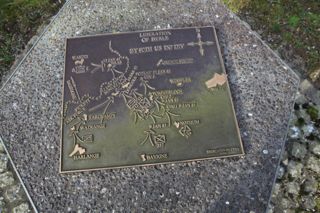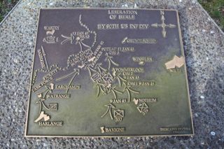 On the left side of Kirchegaass, near the back entrance to the village church Monument A medium sized fieldstone with a bronze plaque dedicated to the 90th Infantry Division and a large sculpture carved in stone. Nearby, following a path, is a cobblestone pillar with a bronze plaque on top with a map detailing the troop movements surrounding the liberation of Berlé.