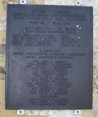 An old weather-beaten dark plaque with engravings commemorating the crew and passengers of the C-47 43-30734 that crashed there.